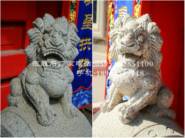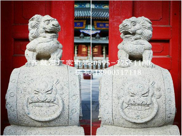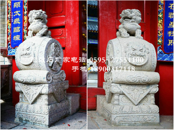 抱鼓石紋樣豐富多彩。鼓座上多浮雕牡丹、荷花、葵花以及如意紋、卷草紋、祥云紋等吉祥紋樣,寓意花好吉祥。鼓面雕刻常運(yùn)用淺浮雕與高浮雕結(jié)合的手法。因獅者為獸中之王,獅紋也成為抱鼓石最常見紋樣,以此顯示舊時(shí)豪門大戶的威嚴(yán)。 另外,鼓是法事專用的樂器,抱鼓石還可看作能夠驅(qū)邪避災(zāi)的法力象征,因而在佛寺、祠堂等大門兩側(cè)也常擺放抱鼓石。
