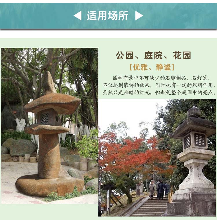 石燈籠是日本石文化的重要內(nèi)容之一,也是近年來(lái)我國(guó)出口日本石制品的一個(gè)重要品種。石燈籠在日本有著非常悠久的歷史。在佛前獻(xiàn)燈火是佛教的重要禮儀之一,自奈良時(shí)代 (公元 710~ 794年 )起日本在修建寺院時(shí)就開(kāi)始在寺院的正面建造石燈籠以保護(hù)向寺院所獻(xiàn)的燈火。日本現(xiàn)存的最古老的石燈籠是奈良時(shí)代的當(dāng)麻寺石燈籠,距今已有一千多年的歷史了。到了江戶時(shí)代 (公元 1603~ 1867年 )石燈籠在日本已廣為流傳,一些寺院里造型精美的石燈籠被作為樣本模仿雕刻以至形成了石燈籠的各種形式。石燈籠被用于園林、庭院的裝飾始于十六世紀(jì)晚期的安土桃山時(shí)代,當(dāng)時(shí)由于茶道的大發(fā)展,石燈籠常被作為茶室的一種露天裝飾物而廣泛進(jìn)入庭院裝飾。隨著石燈籠用途的改變,石燈籠的樣式也就更加多樣化了,例如出現(xiàn)了三腳或四腳的雪見(jiàn)燈籠,同時(shí)對(duì)竿和笠的部分也給予新的設(shè)計(jì),石燈籠的式樣由模仿進(jìn)入創(chuàng)新?,F(xiàn)在日本的石燈籠除了少量用于寺院神社以外,大多數(shù)的石燈籠是用于庭院、園林裝飾使用。