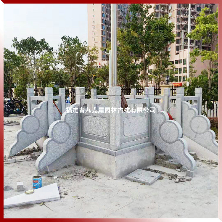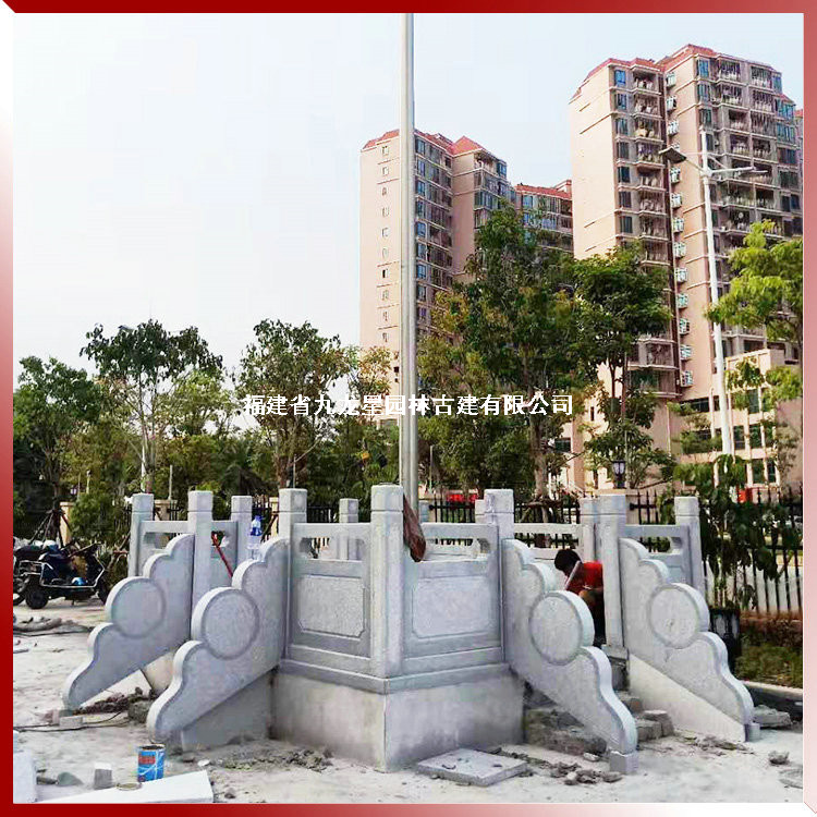 上圖石雕旗臺護欄,學(xué)校升旗臺石欄桿選用天然石材花崗巖生產(chǎn)加工,欄桿構(gòu)件有立柱、柱頭、欄板、抱鼓等幾部分組成,由九龍星園林古建制作安裝。