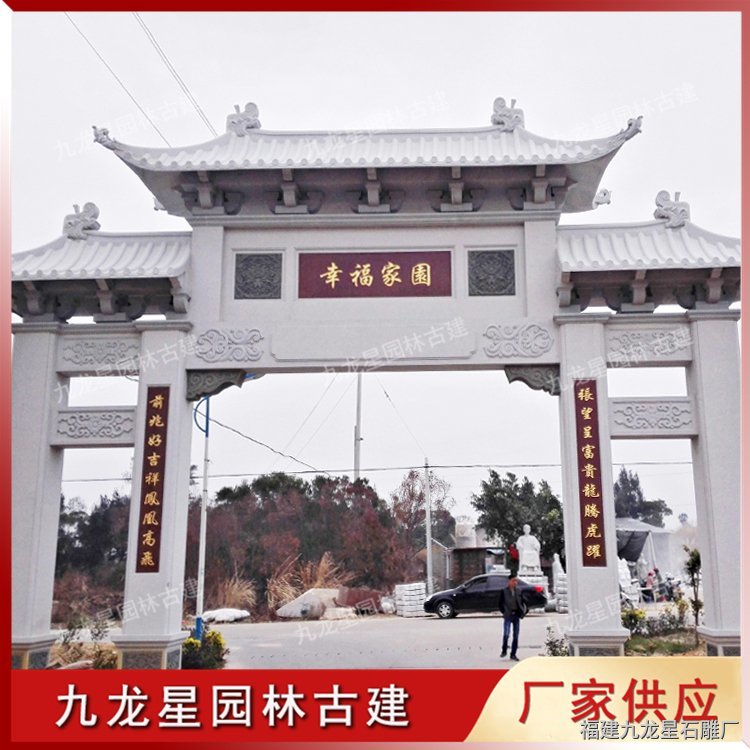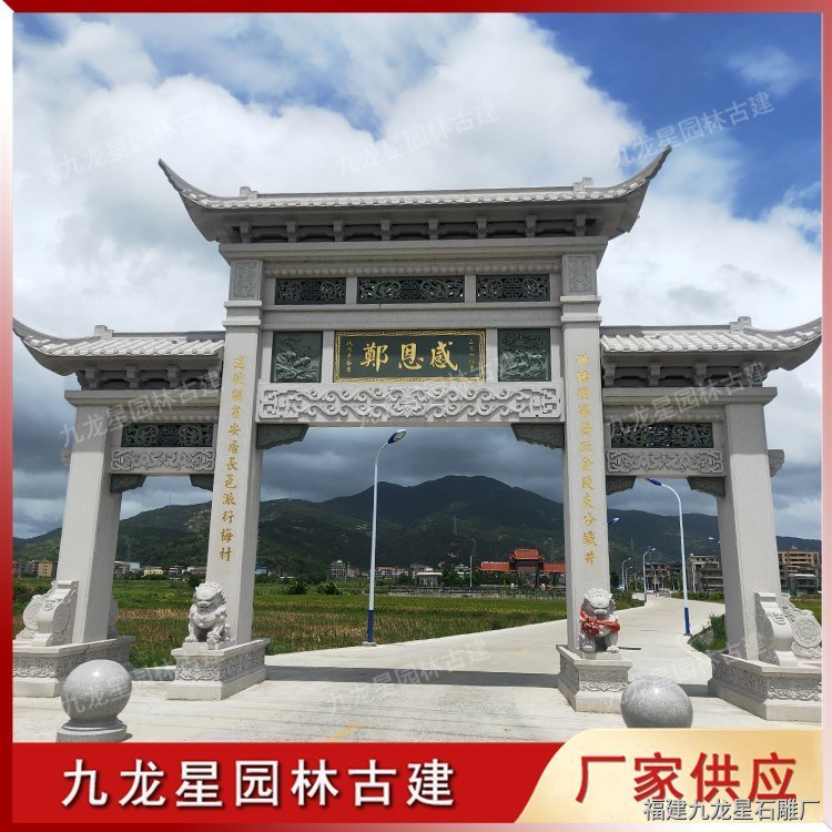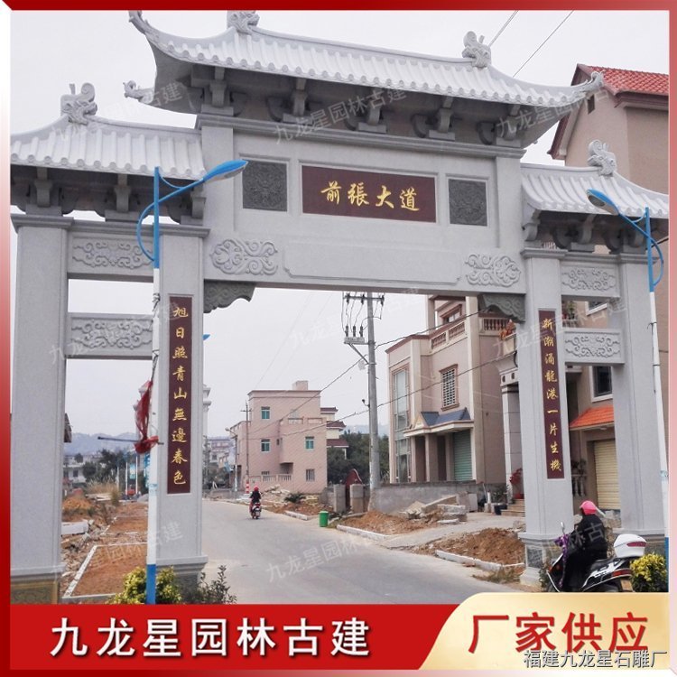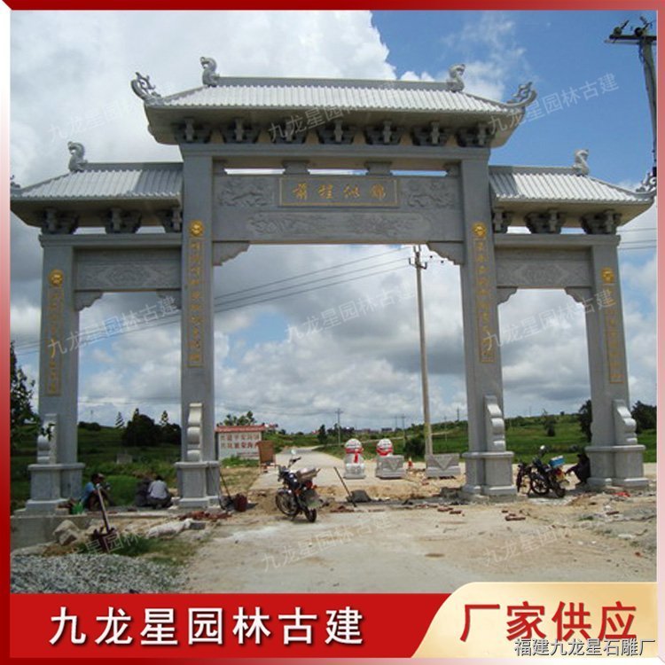 農村石雕牌坊常見是用青石、花崗巖制作加工,經過石雕牌坊訂制公司精心雕刻而成。石牌坊多樣的外觀形態,豐富的文化內涵,使得村石石雕牌坊成為新農村建設的標志性建筑。